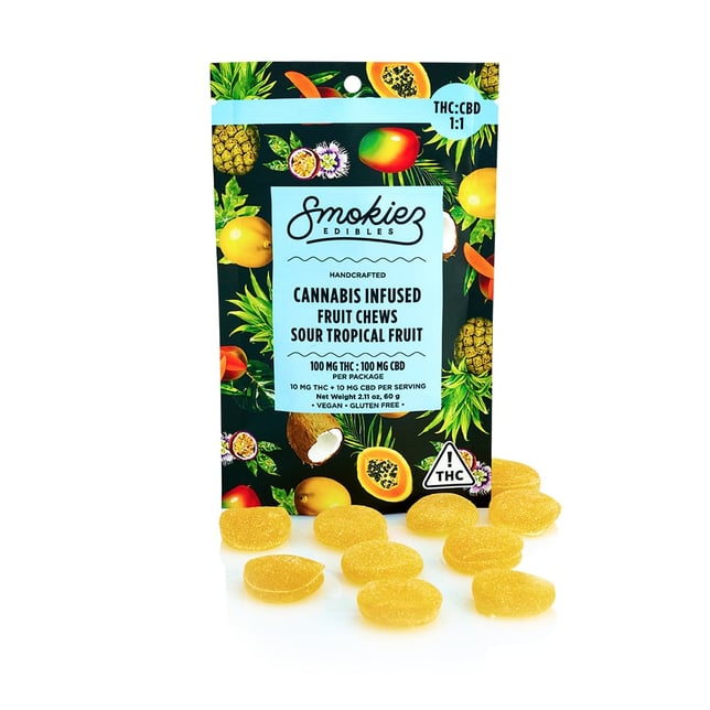 A harmonic blend of CBD and THC, Smokiez Sour Tropical Fruit CBD:THC 1:1 Fruit Chews are NOT YOUR AVERAGE FRUIT CHEWS™ ;)