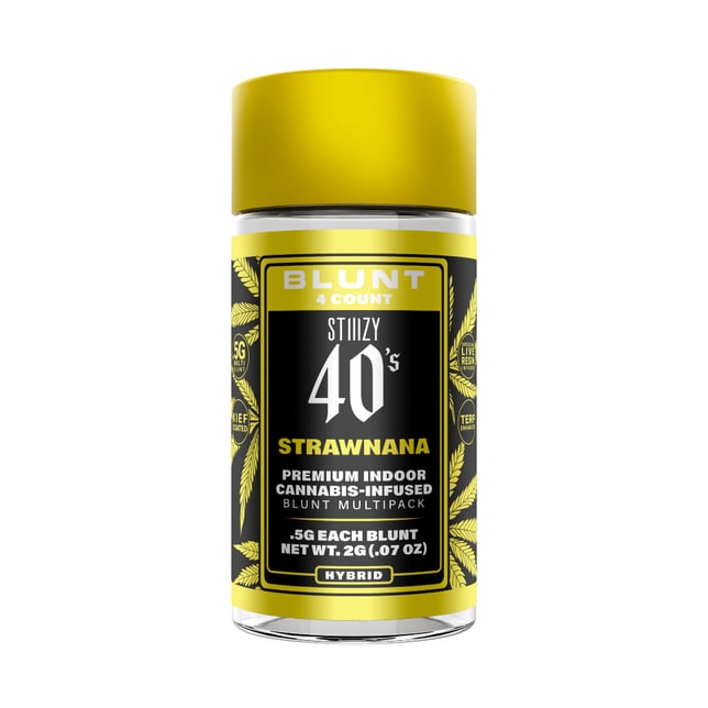 STIIIZY 40's Mini Blunts Multipack is filled with premium grown STIIIZY cannabis and packed in individual glass vials to maintain freshness and potency. Each 40's Mini Blunt is rolled with 100% tobacco free, kief dusted hemp wraps which packs a flavorful and potent punch with every exhale, and the tightly secured tips have been perfected to provide an amazing and consistent burn every time. The STIIIZY 40's Mini Blunts Multipack is reinventing your high experience by being one of the first to introduce 40% THC and total cannabinoids potency with special live resin infusion.